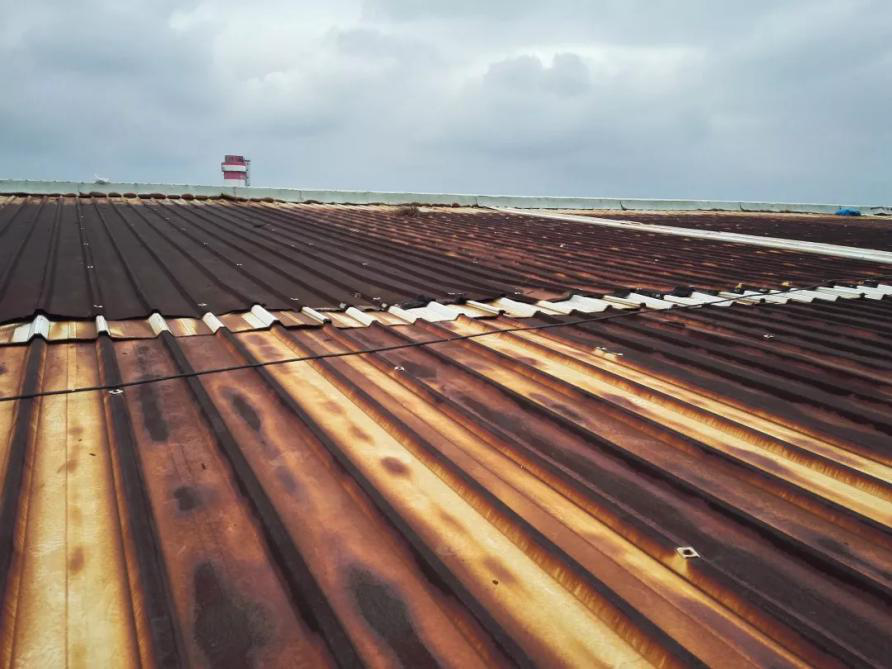 上圖是某企業光伏電站屋頂實拍,從圖中我們可以看到廠房屋頂已經被嚴重腐蝕,呈現鐵銹色,因長時間雨水沖刷,腐蝕性環境等因素,屋檐、角落被腐蝕的情況尤為嚴重,甚至暴露出建筑內部結構,用手輕輕用力就能掰彎掰斷,根本無法起到保護作用,造成嚴重的安全隱患。